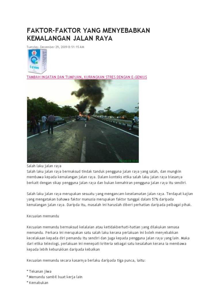 Bahan bacaanfaktor-faktor yang menyebabkan kemalangan jalan raya Salah laku jalan raya Dalam konteks etika salah laku jalan raya biasanya berkait dengan sikap pengguna jalan raya dan bukan kemahiran pengguna jalan raya itu sendiri. Kemalangan jalan raya secara umumnya boleh didefinisikan sebagai suatu kejadian yang tidak diingini. Faktor pertama kemalangan jalan raya berlaku kebiasaannya disebabkan oleh kelalaian manusia sebelum memulakan perjalanan July 30 2012 at 957 PM Anonymous said.