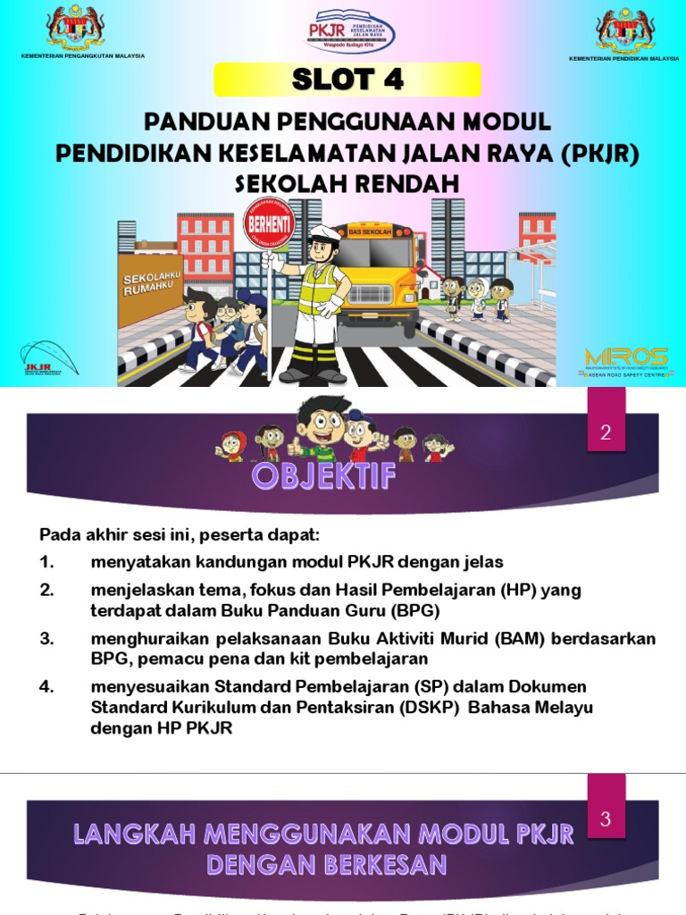Program ini bertujuan melahirkan pengguna jalan raya yang berhemah dan berdisiplin serta mencapai matlamat mengurangkan kadar kemalangan. Dunia Norhanisr P P Pkjr Tahun 3. Pendidikan keselamatan jalan raya merupakan proses pendidikan sepanjang hayat dan harus bermula di peringkat sekolah rendah merangkumi program bagi mengajarkan amalan keselamatan lalu lintas dari seawal sekolah rendah hingga ke sekolah menengah supaya pendidikan keselamatan jalan raya menjadi sebahagian daripada amalan budaya dan amalan bagi setiap kanak-kanak di Malaysia.